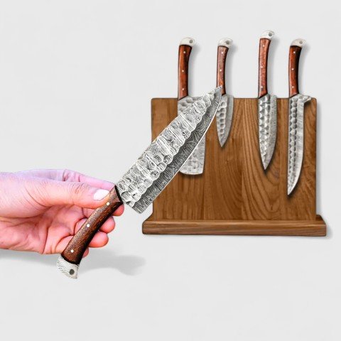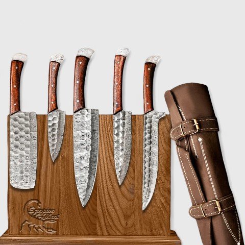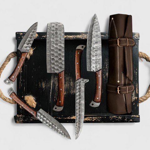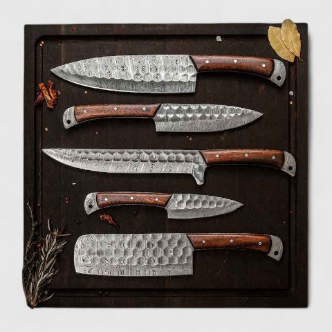 Discover Dadsoncrafts Kitchen Knife as epitome of culinary excellence with our Pro Chef Knife Set, a collection crafted for both seasoned chefs and cooking enthusiasts. Each knife is meticulously handmade with precision, featuring custom Damascus steel knives that not only showcase top-tier quality but also offer a unique aesthetic appeal. Crafted with the utmost care and passion, each knife in this set is a stroke of culinary genius. From the perfectly balanced blades to the custom Damascus steel, every detail exudes pride in craftsmanship. This Kitchen Set is a testament to the fusion of artistry and functionality, providing chefs with the tools they need to elevate their cooking to new heights.