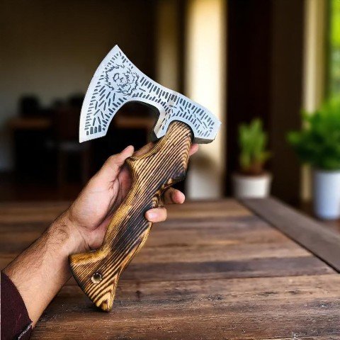 The Dreamweaver Bearded Small Camping Hatchet is a stunning and functional tool crafted from high carbon steel, with a blade hardness of HRC 58-60. Hand-sharpened for precision, its durable blade effortlessly cuts through wood and trees. Featuring unique etched designs that resist fading over time, this axe is both a practical tool and a lifelong keepsake. The beautifully carved ashwood handle provides strength, flexibility, and an attractive texture, enhancing its overall appeal.