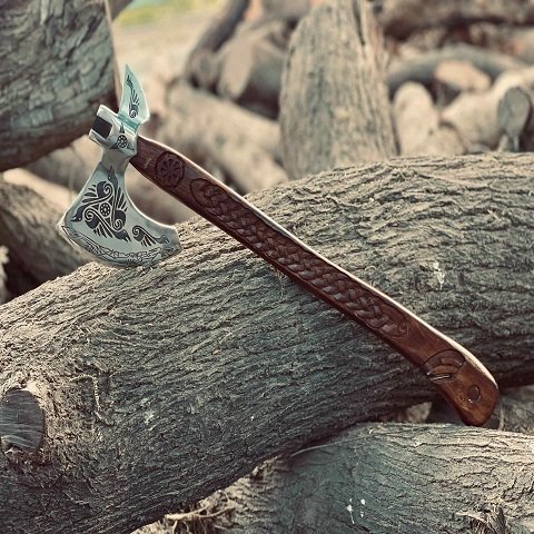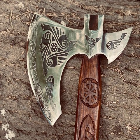 - Hand-Forged Carbon Steel Blade: Sharp, durable, and etched with Viking-inspired designs.