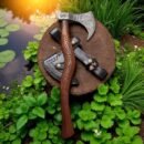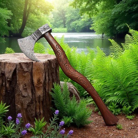 The Viking Axe features a stunning rosewood carving shaft and a beautifully crafted Damascus steel blade, making it a striking blend of artistry and functionality. This custom handmade axe is designed for durability and performance, ideal for collectors and outdoor enthusiasts alike. It comes with a high-quality cowhide sheath for safe storage and transport, ensuring this exceptional piece is both practical and visually captivating.