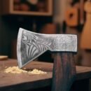 The WildWanderer Camping Hatchet, inspired by the legendary Fenrir wolf, is a powerful and stylish tool. Its sharp blade and comfortable handle make it perfect for various outdoor tasks. The intricate etching on the axe head adds a touch of Norse mythology, making it a unique and visually appealing piece.